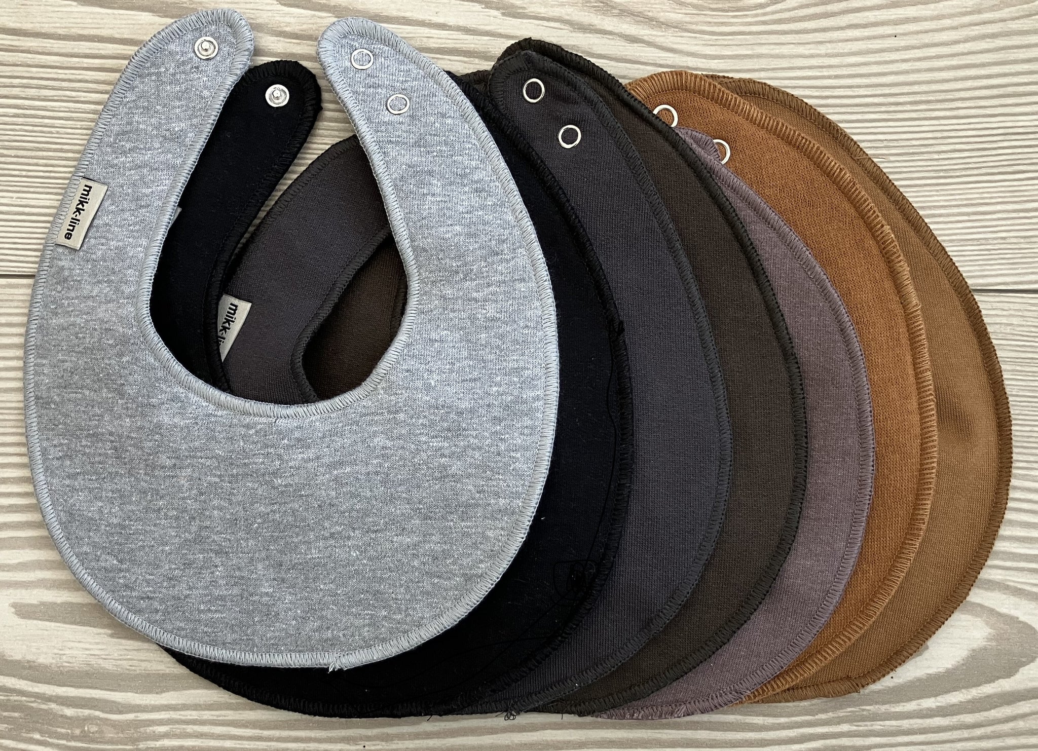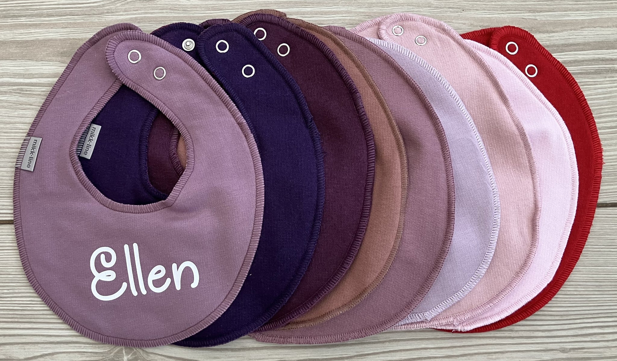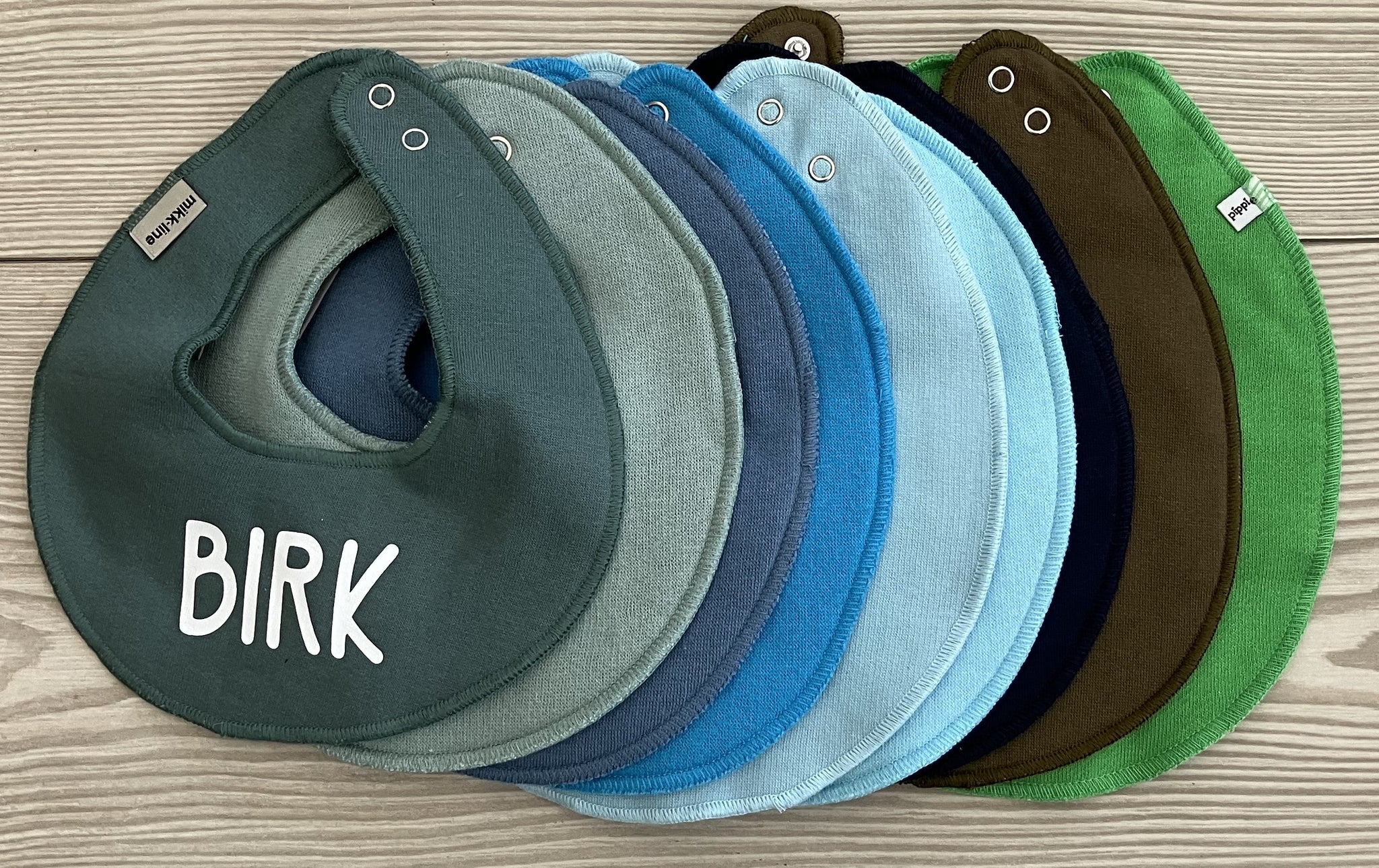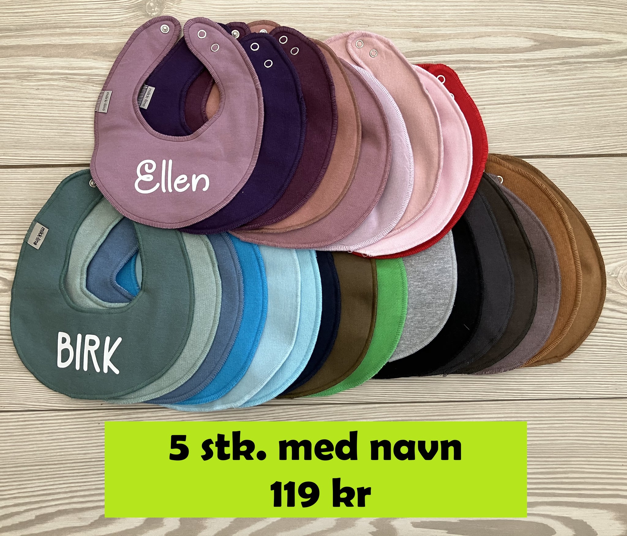 Pakken består af runde hagesmække fra Mikk-Line, i de farver du kan se på billederne. Der bliver trykt samme navn på alle 5 hagesmække i samme tekstfarve og de 5 farver udvælges tilfældigt.
